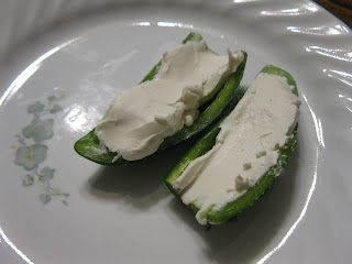 Simply cut the stem end of each pepper off and under cold, running water, scoop out the seeds and membranes.  Then fill each half with cream cheese.  Serve cold.  So nice!