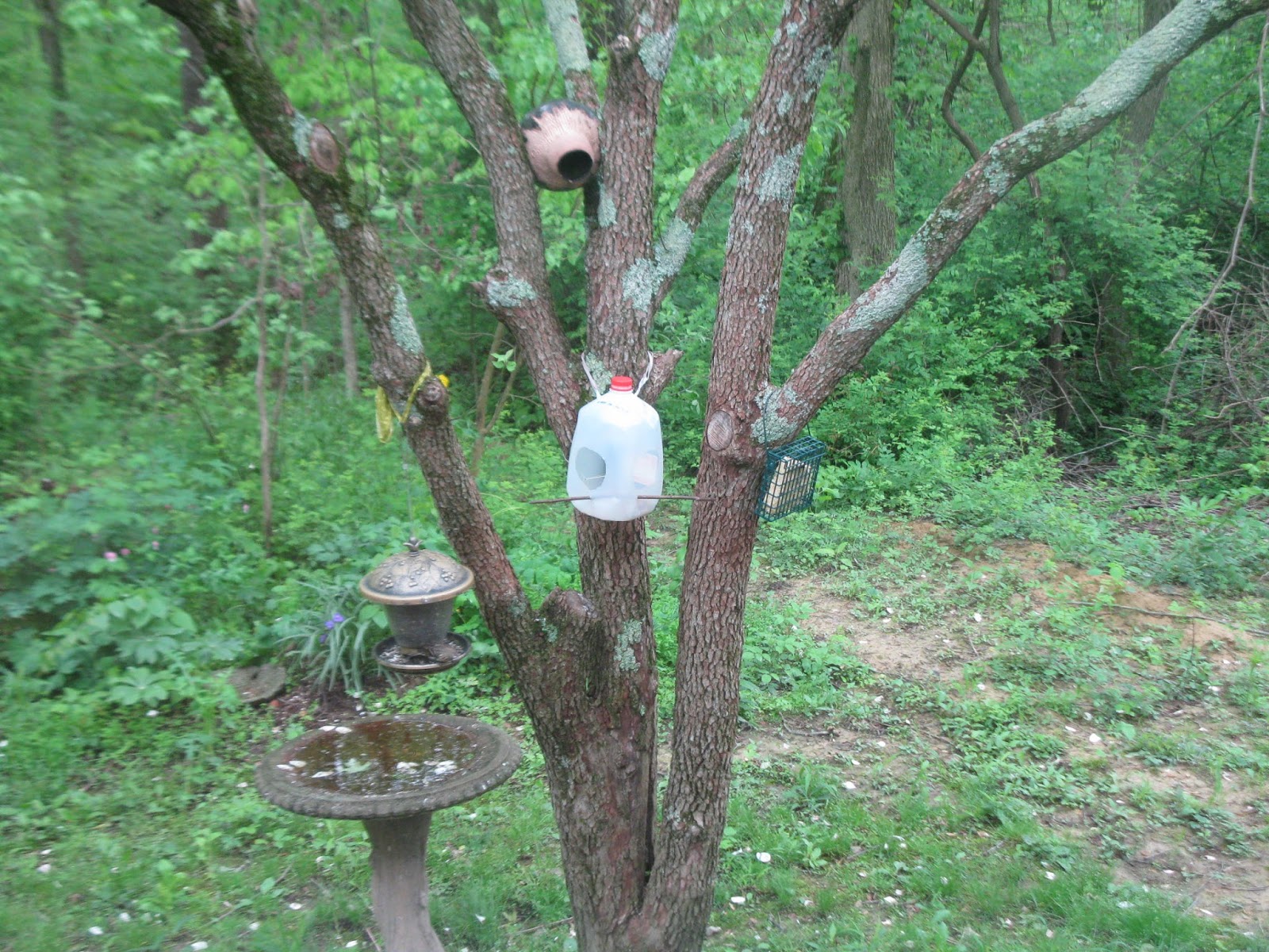 In the small hanging feeder on the left are black oil sunflower seeds. The milk jug has the suet crumbles I made 3 months ago, and of course you can see the regular block of suet at the right.